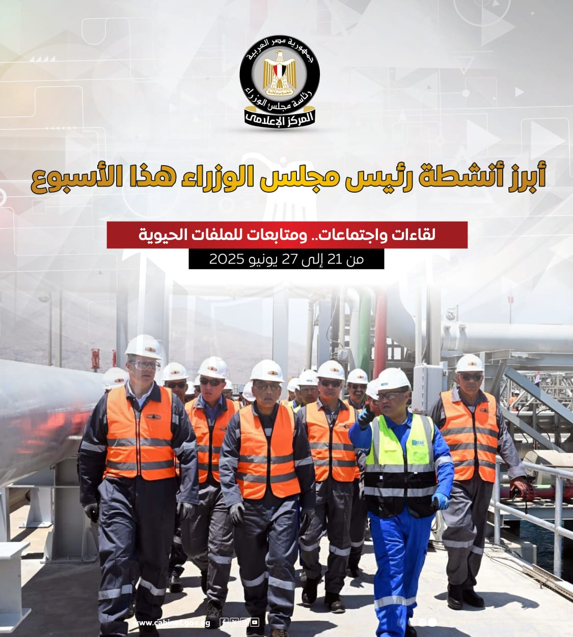 نشر المركز الإعلامي لمجلس الوزراء، عددًا من الإنفوجرافات عبر منصاته على مواقع التواصل الاجتماعي، استعرض خلالها أبرز أنشطة الدكتور مصطفى مدبولي، رئيس مجلس الوزراء، خلال الأسبوع الجاري من 21 إلى 27 يونيو ٢٠٢٥، والتي شملت لقاءات واجتماعات.. ومتابعات للملفات الحيوية