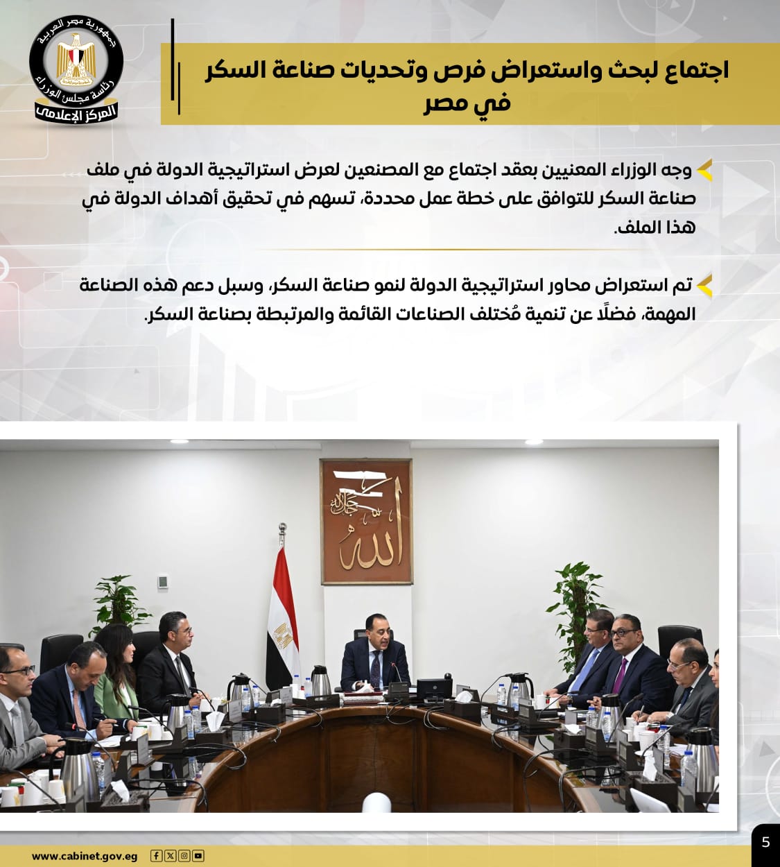 وتضمنت الأنشطة، عقد رئيس الوزراء اجتماع لبحث واستعراض فرص وتحديات صناعة السكر في مصر، حيث وجه سيادته الوزراء المعنيين بعقد اجتماع مع المصنعين للتوافق على خطة عمل محددة، تسهم في تحقيق أهداف الدولة في هذه الصناعة الهامة، وخلال الاجتماع تم استعراض استراتيجية الدولة لنمو صناعة السكر، وسبل دعمها، فضلًا عن تنمية مُختلف الصناعات المرتبطة بها.