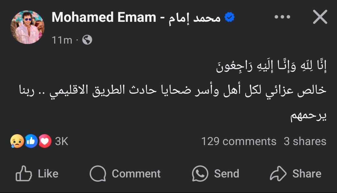 وكتب عبر حسابه الرسمي على موقع التواصل الاجتماعي الفيسبوك: “إِنَّا لِلَّهِ وَإِنَّا إِلَيْهِ رَاجِعُونَ، خالص عزائي لكل أهل وأسر ضحايا حادث الطريق الاقليمي .. ربنا يرحمهم”.
