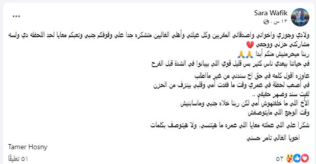 وجهت المخرجة سارة وفيق رسالة شكر وامتنان للنجم تامر حسني وذلك بعد مساندتها في وفاة والدتها مؤكدة أنه سند وضهر لها وقت وجعها وحزنها علي فراق والدتها.