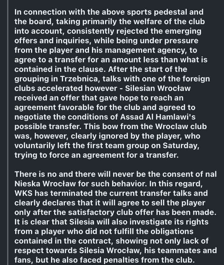 وكشف النادي البولندي أن مفاوضات كانت قد بدأت مؤخرًا مع أحد الأندية الأجنبية – دون ذكر الاسم – بعد تلقّي عرض بدا في البداية أنه قد يحقق انفراجة، وهو ما دفع النادي للموافقة على الدخول في محادثات رسمية بشأن الصفقة.