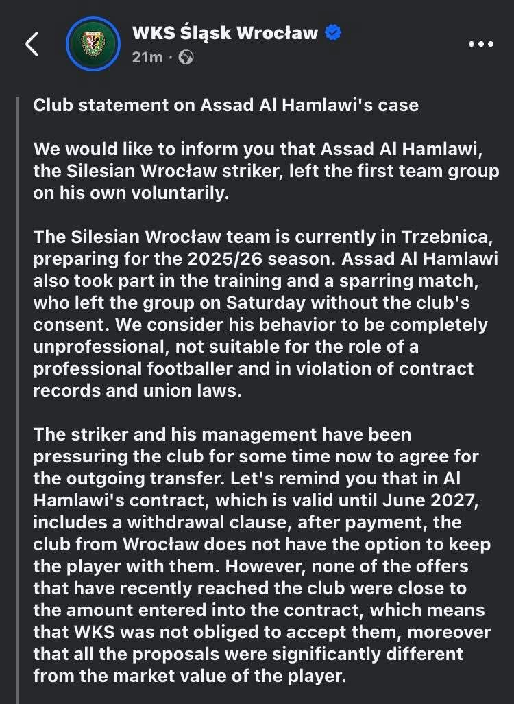 وجّه نادي سيليزيا فروتسواف البولندي انتقادات حادة للاعبه الفلسطيني أسد الحملاوي، مهاجم الفريق الأول لكرة القدم، بعد مغادرته معسكر إعداد الفريق للموسم الجديد دون الحصول على إذن رسمي من الجهاز الفني أو الإدارة، وسط تقارير تربط اللاعب بالانتقال إلى النادي الأهلي المصري خلال فترة الانتقالات الصيفية الحالية.