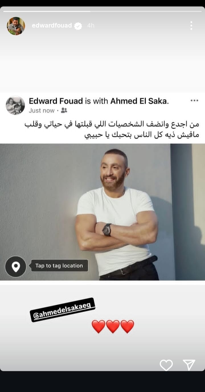ونشر إدوارد صورة لـ أحمد السقا من خلال حسابه الرسمي عبر موقع تبادل الصور والفيديوهات القصيرة “إنستجرام”، عبر خاصية استوري، ووجه من خلالها بعض الكلمات، وقال: “من اجدع وانضف الشخصيات اللي قبلتها في حياتي وقلب مافيش ذيه كل الناس بتحبك يا حبيبي”.