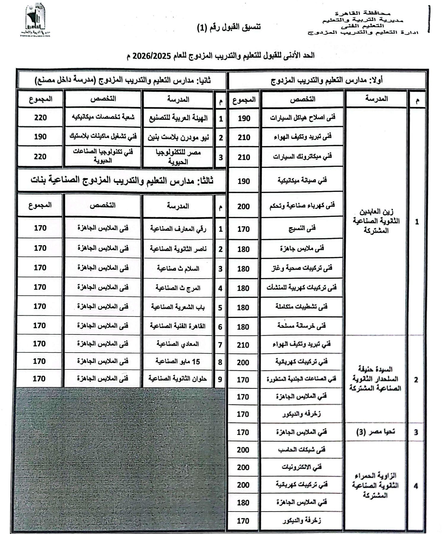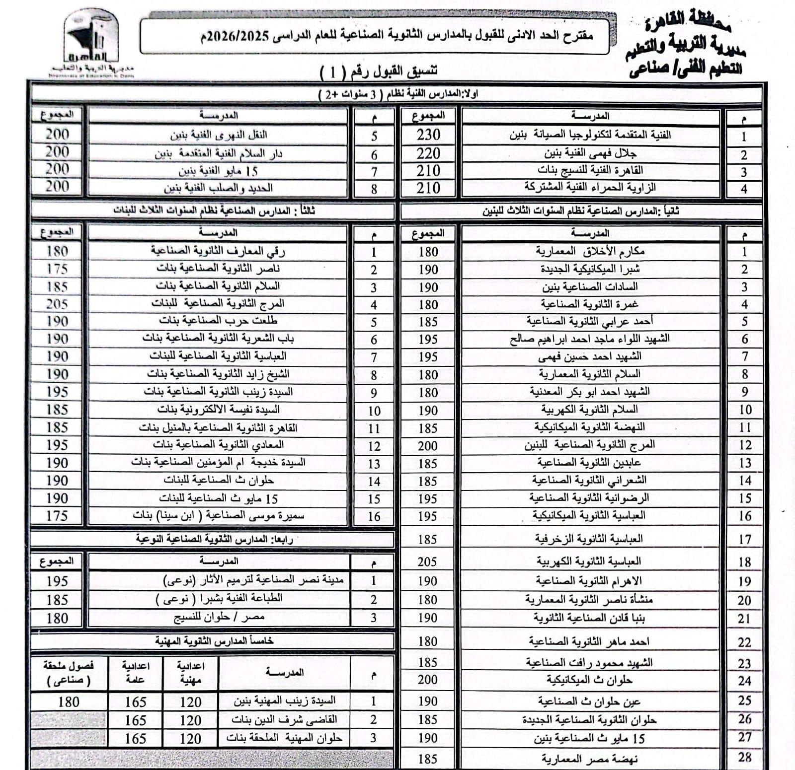 كما اعتمد د. إبراهيم صابر محافظ القاهرة تنسيق القبول بمدارس التعليم الفنى ( صناعى ، تجارى ، فندقى ، زراعى ) للعام الدراسى ٢٠٢٥ / ٢٠٢٦.