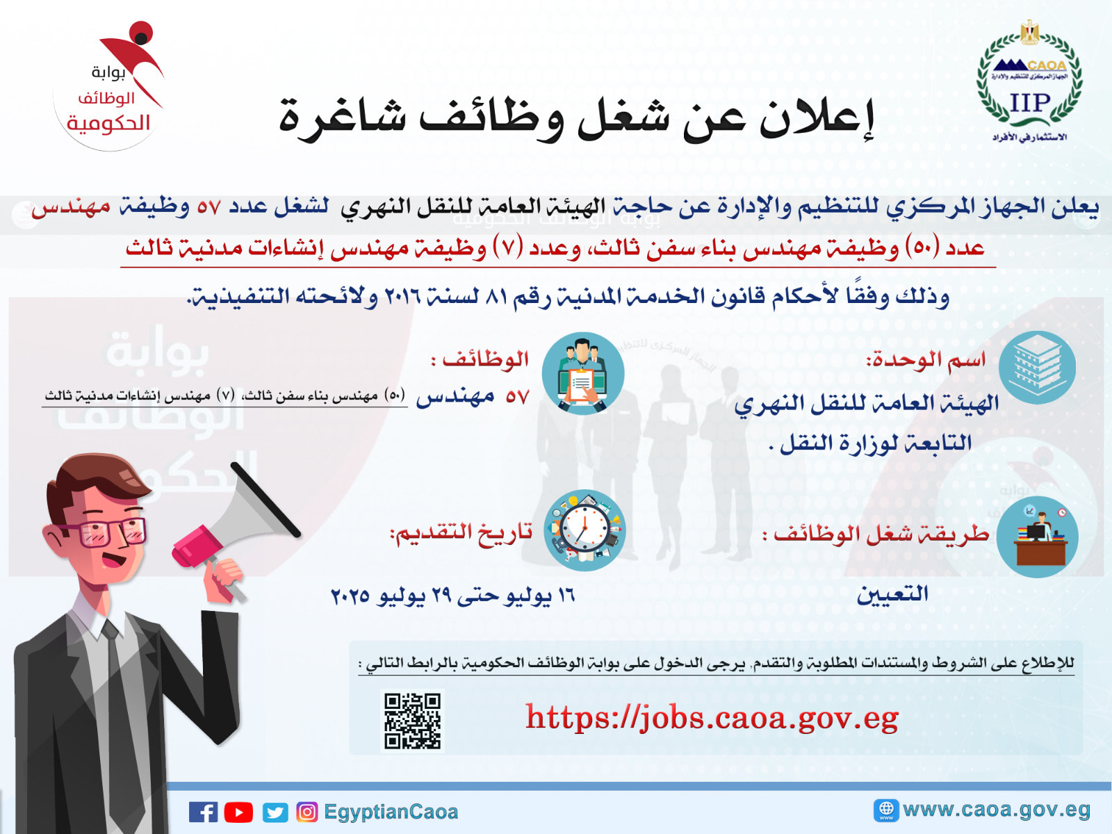 أعلن الجهاز المركزي للتنظيم والإدارة، برئاسة المهندس حاتم نبيل، عن حاجـة الهيئة العامة للنقل النهري التابعة لوزارة النقل، لشغل عدد من الوظائف الهندسية الشاغرة، وذلك وفقًا لأحكام قانون الخدمة المدنية رقم 81 لسنة 2016 ولائحته التنفيذية.