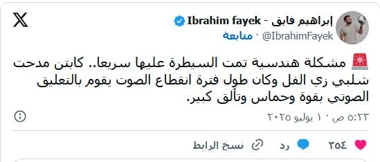 كما علّق الإعلامي إبراهيم فايق على الواقعة عبر حسابه الرسمي بمنصة "إكس"، مؤكدًا أن المعلق الكبير مدحت شلبي كان مستمرًا في التعليق داخل الكابينة بشكل طبيعي، وقال: "كان زي الفل ومتحمس كعادته"، لافتًا إلى أن الانقطاع لم يكن من طرف المعلق، بل نتيجة خلل تقني خارجي.