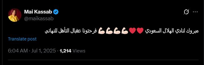 مي كساب تهنئ الهلال السعودي بعد فوزه على مانشستر سيتي (صورة)