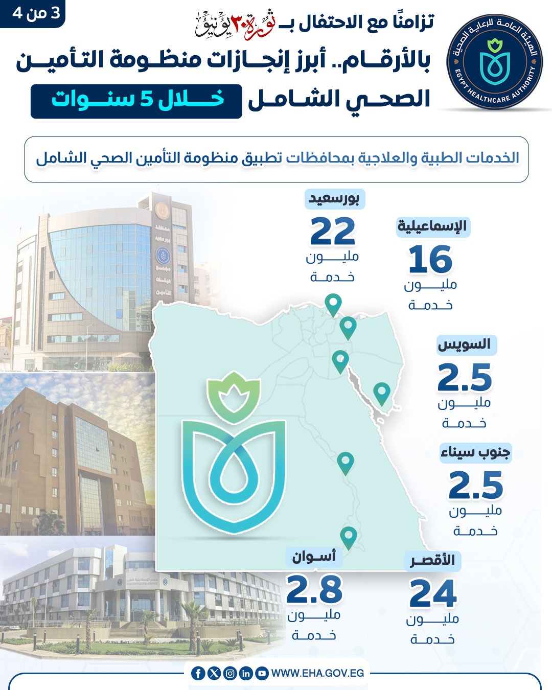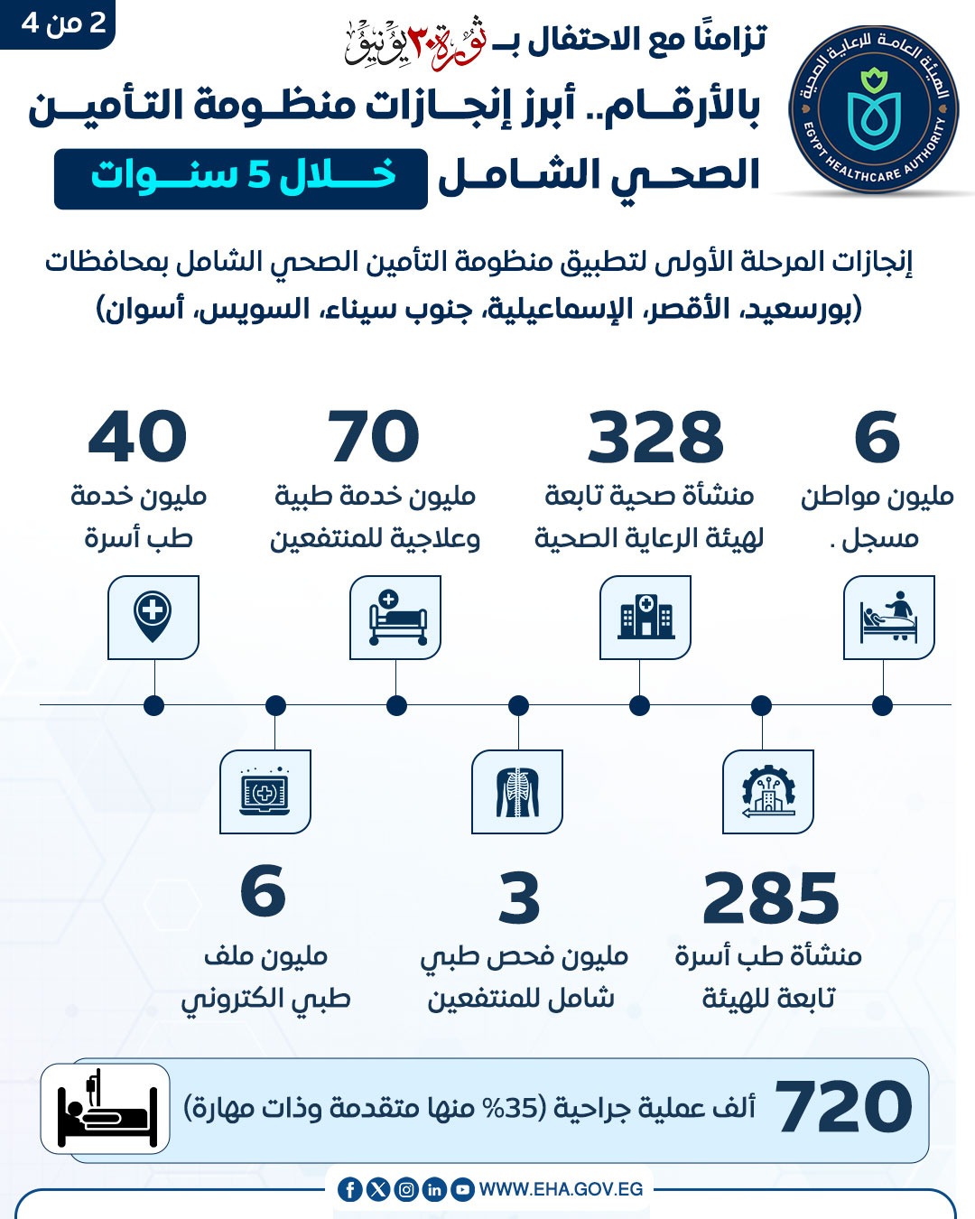 وفي هذا الإطار، أبرز الإنفوجراف تسجيل أكثر من 6 ملايين مواطن ضمن محافظات المرحلة الأولى الست وهي بورسعيد والأقصر والإسماعيلية وجنوب سيناء والسويس وأسوان، وبلغ إجمالي عدد المنشآت الصحية التابعة للهيئة في هذه المحافظات 328 منشأة، من بينها 285 منشأة لطب الأسرة قدمت ما يزيد على 40 مليون خدمة في هذا التخصص، وبلغ عدد الخدمات الطبية والعلاجية المقدمة بمحافظة بورسعيد 22 مليون خدمة، تليها الأقصر بـ24 مليون خدمة، ثم الإسماعيلية بـ16 مليون خدمة، في حين قدمت محافظتا جنوب سيناء والسويس 2.5 مليون خدمة لكل منهما، بينما سجلت محافظة أسوان 2.8 مليون خدمة منذ انطلاق المنظومة بها.
