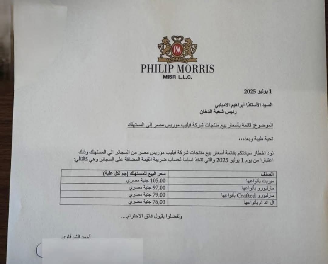 أعلنت شركة "فيليب موريس مصر" عن تحديث أسعار بيع منتجاتها من السجائر والتبغ المسخن في السوق المحلي، على أن يتم تطبيق الأسعار الجديدة بدءًا من اليوم، 1 يوليو 2025، وذلك وفقًا لقائمة الأسعار الرسمية التي أُرسلت إلى شعبة الدخان.