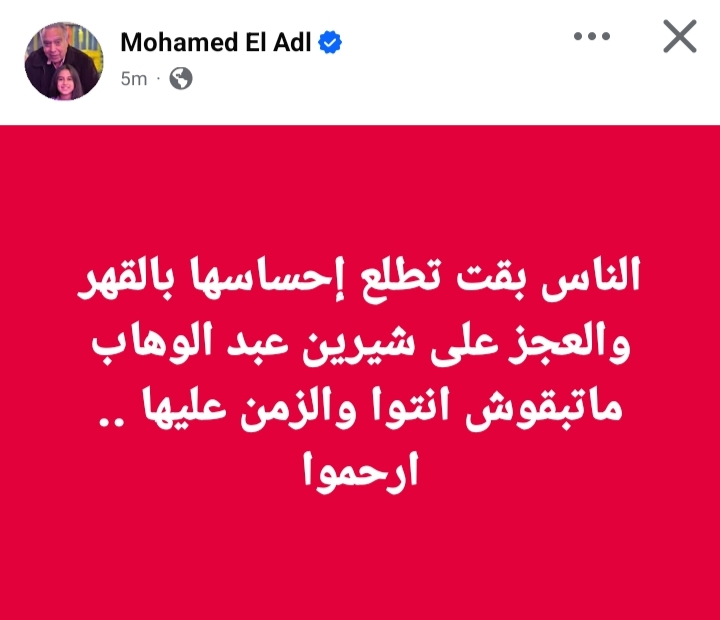 وكتب محمد العدل، من خلال حسابه الرسمي عبر موقع التواصل الاجتماعي فيسبوك، قال: "الناس بقت تطلع إحساسها بالقهر والعجز على شيرين عبد الوهاب، ماتبقوش انتوا والزمن عليها.. ارحموا".