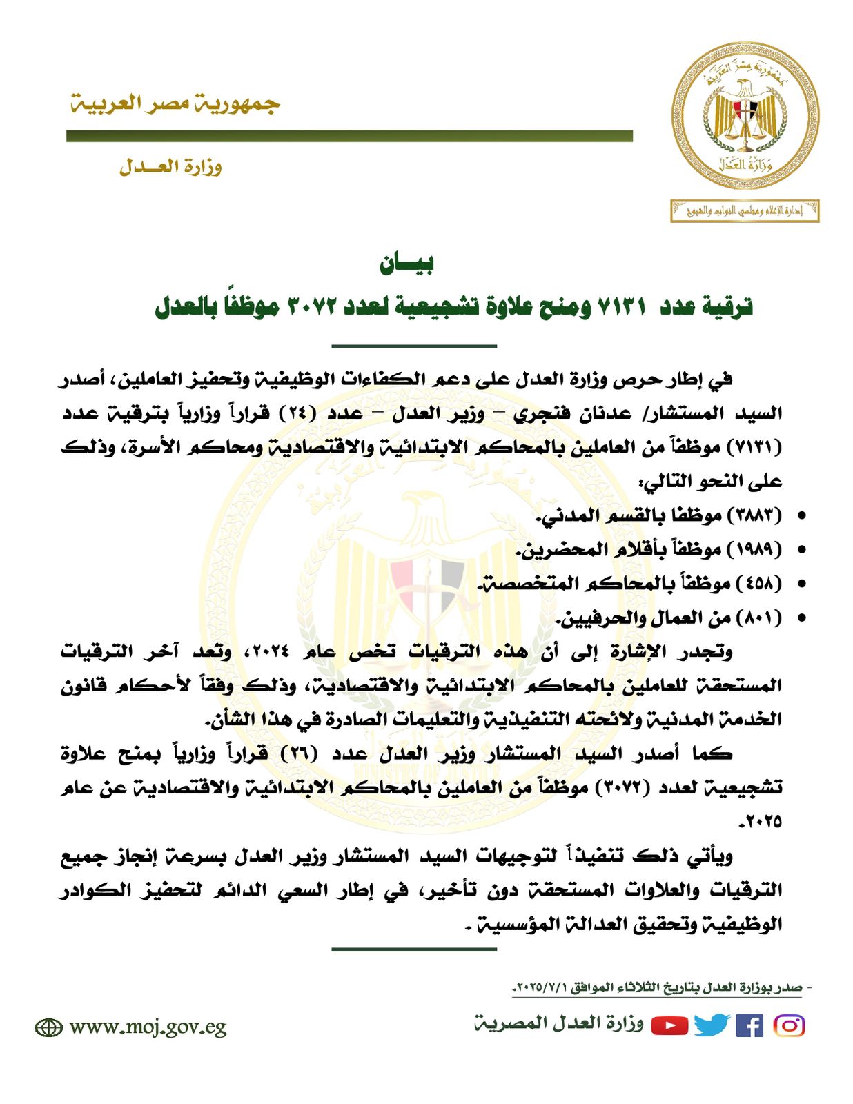 كما أصدر وزير العدل عدد 26 قراراً وزارياً بمنح علاوة تشجيعية لعدد 3072 موظفاً من العاملين بالمحاكم الابتدائية والاقتصادية عن عام ٢٠٢٥، ووجه بسرعة إنجاز جميع الترقيات والعلاوات المستحقة دون تأخير، في إطار السعي الدائم لتحفيز الكوادر الوظيفية وتحقيق العدالة المؤسسية.
