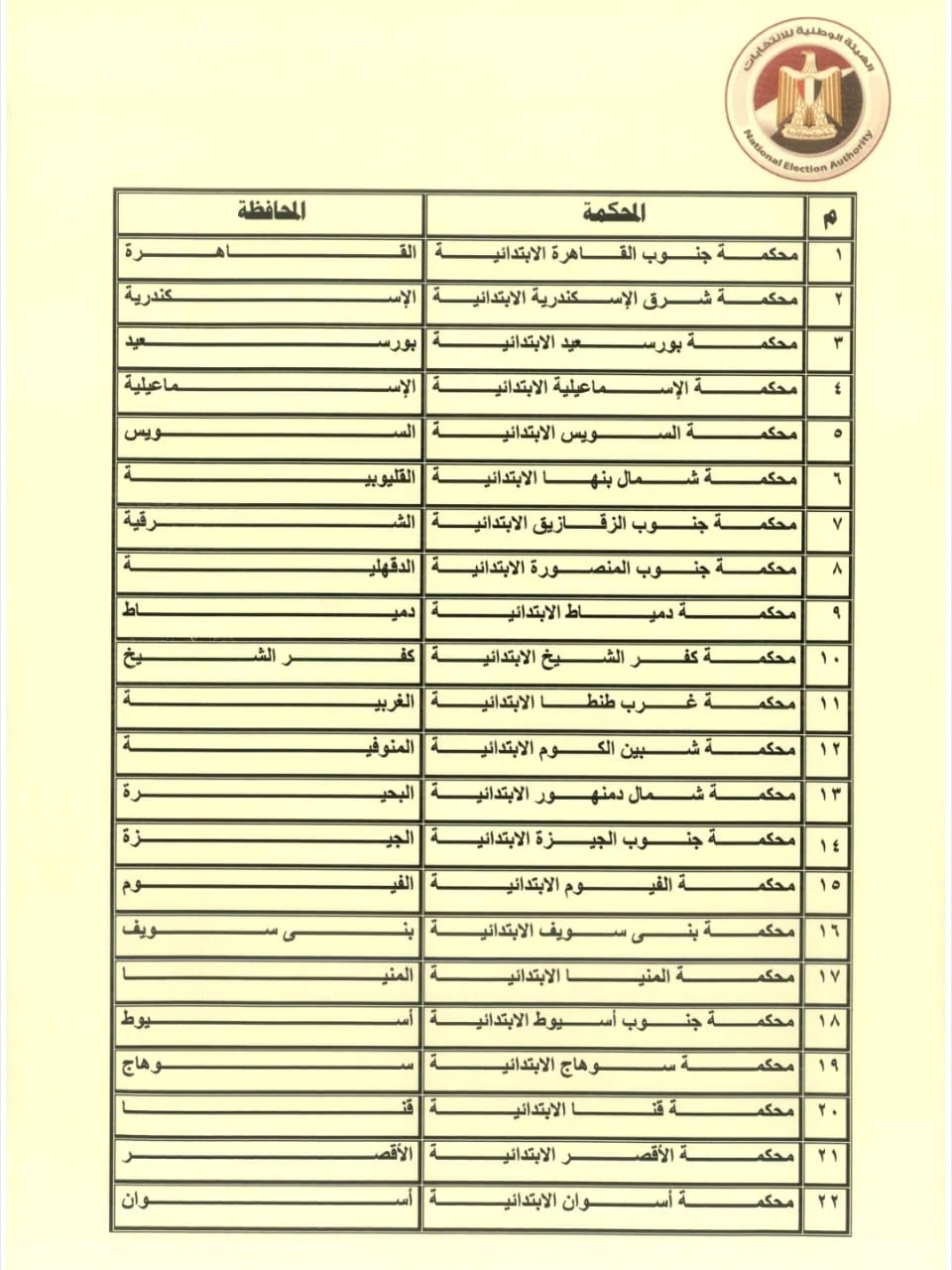 كما تتولى لجان متابعة سير العملية الانتخابية بالمحاكم الابتدائية التالية تلقى طلبات الترشح في نظام القوائم على النحو التالي:
