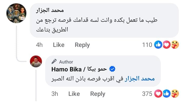 ليرد عليه مطرب المهرجانات حمو بيكا، قائلًا: “في أقرب فرصة بإذن الله، الصبر”.