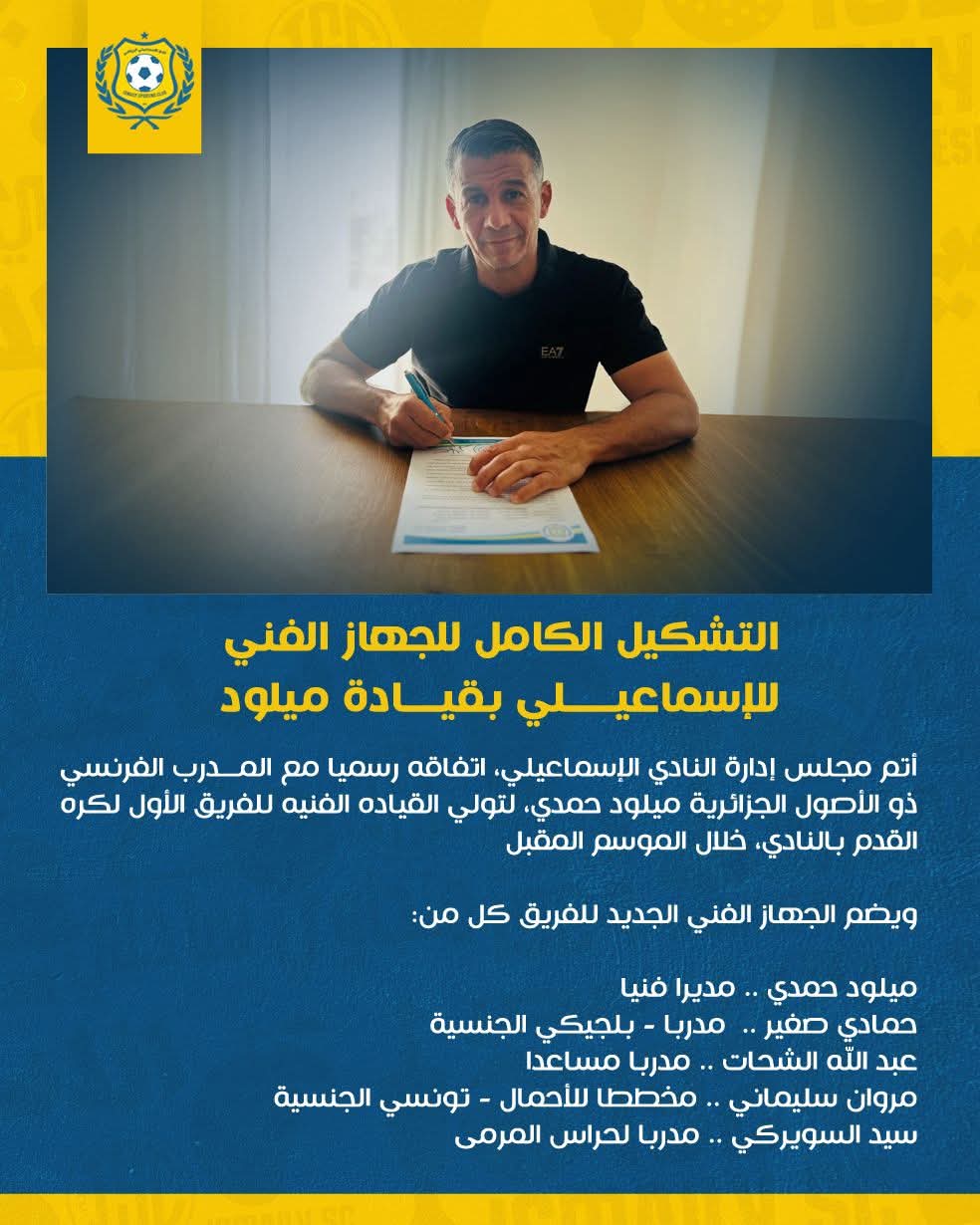 أتم مجلس إدارة النادي الإسماعيلي اتفاقه رسميا مع المدرب الفرنسي ذو الأصول الجزائرية ميلود حمدي، لتولي القيادة الفنية للفريق الأول لكرة القدم بالنادي الإسماعيلي خلال الموسم المقبل.