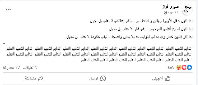 وكتب فواز عبر صفحته الرسمية "فيس بوك" لما تقول شغل الأوبرا روقان و لطافة بس .. تبقى إعلامي لا تعلم، بل تجهل، لما تقول امسح أغاني المرحوم .. تبقى فنان لا تعلم، بل تجهل، لما تقر قانون خطر زي ده في التوقيت ده بلا بدائل واضحة .. تبقى حكومة لا تعلم، بل تجهل.