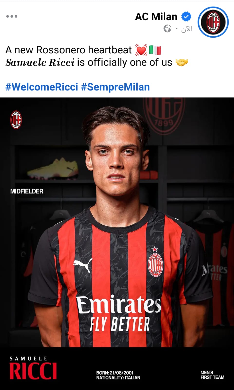 أعلن نادي ميلان الإيطالي، اليوم، عن التعاقد رسميًا مع لاعب الوسط سامويلي ريتشي قادمًا من صفوف تورينو، في صفقة انتقال نهائي، ضمن خطة النادي لتدعيم خط الوسط بعناصر شابة وواعدة.