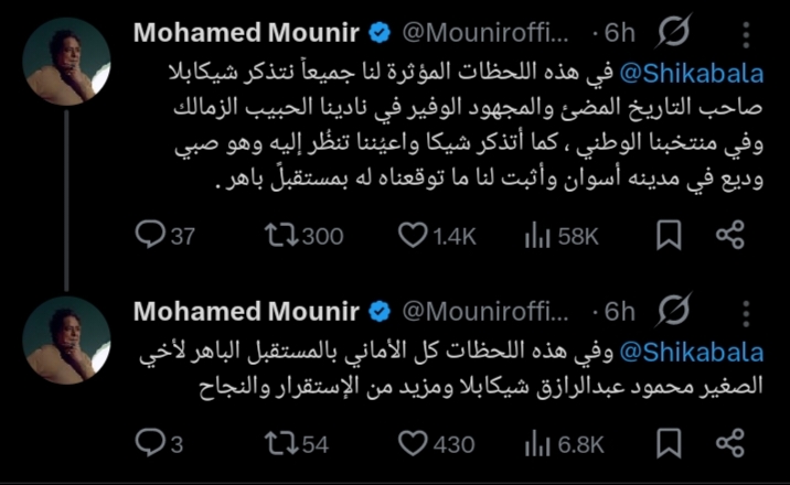 وكتب محمد منير في تغريدة له، من خلال حسابه الرسمي عبر موقع التواصل الاجتماعي "X"، قال:" في هذه اللحظات المؤثرة لنا جميعاً نتذكر شيكابلا صاحب التاريخ المضئ والمجهود الوفير في نادينا الحبيب الزمالك وفي منتخبنا الوطني".
