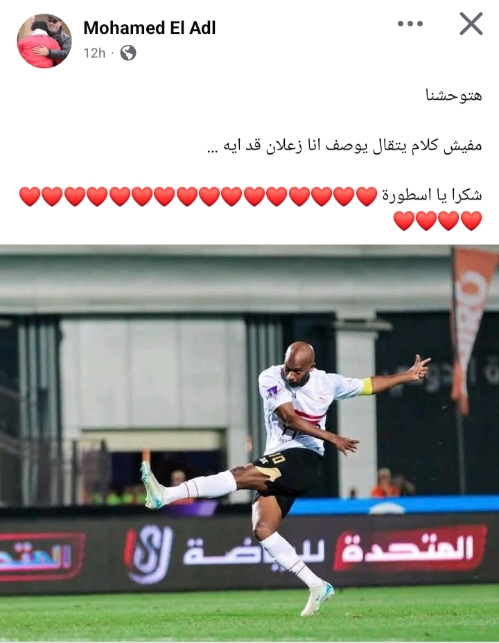 ونشر محمد العدل صورة لـ شيكابالا، من خلال حسابه الرسمي عبر موقع التواصل الاجتماعي فيسبوك، وكتب: "هتوحشنا.. مفيش كلام يتقال يوصف أنا زعلان قد ايه.. شكرًا يا اسطورة".