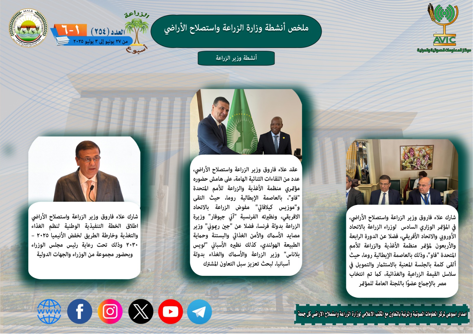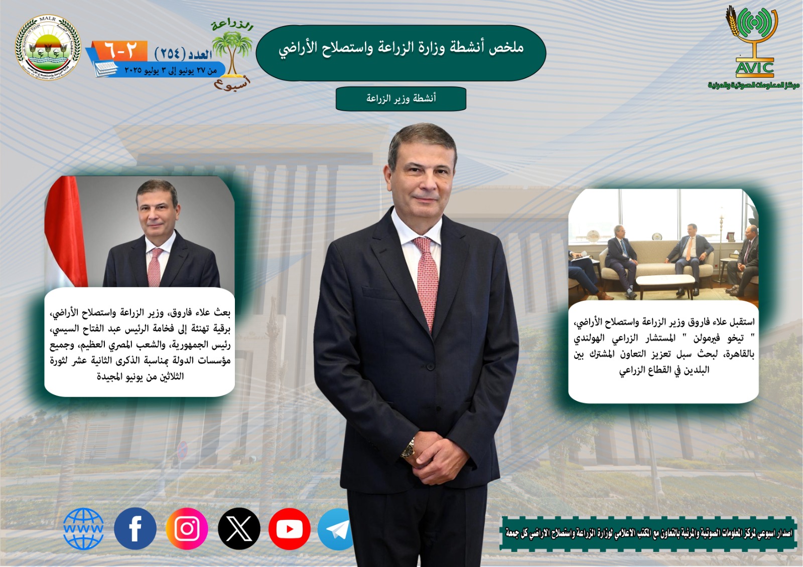 وبعث وزير الزراعة، برقية تهنئة إلى فخامة الرئيس عبد الفتاح السيسي، رئيس الجمهورية، والشعب المصري العظيم، وجميع مؤسسات الدولة بمناسبة الذكرى الثانية عشر لثورة الثلاثين من يونيو المجيدة، كما نشر مركز المعلومات الصوتية والمرئية انفوجرافا، تناول خلاله أبرز المحطات والرسائل لمشاركة علاء فاروق وزير الزراعة، في اجتماعات "الفاو" بالعاصمة الإيطالية ـ روما، حيث شارك في المؤتمر الوزاري السادس لوزراء الزراعة بالاتحاد الأوروبي والاتحاد الأفريقي، فضلا عن الدورة الرابعة والأربعون لمؤتمر منظمة الأغذية والزراعة للأمم المتحدة "فاو".