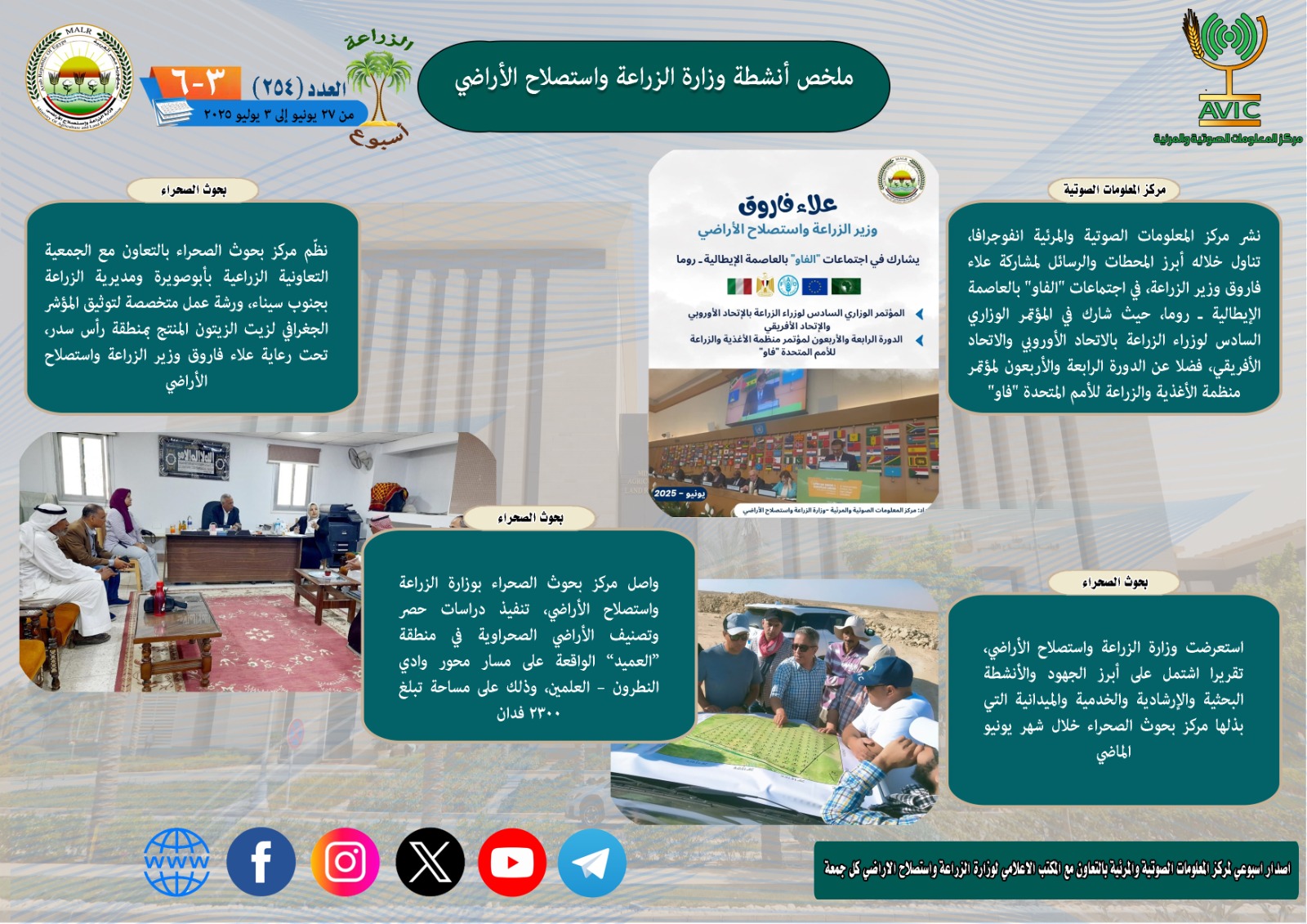 واستعرضت وزارة الزراعة واستصلاح الأراضي، تقريرا اشتمل على أبرز الجهود والأنشطة البحثية والإرشادية والخدمية والميدانية التي بذلها مركز بحوث الصحراء خلال شهر يونيو الماضي، حيث واصل المركز، تنفيذ دراسات حصر وتصنيف الأراضي الصحراوية في منطقة “العميد” الواقعة على مسار محور وادي النطرون – العلمين، وذلك على مساحة تبلغ 2300 فدان والمنسق العام للمبادرة في الوزارة. كما واصلت وزارة الزراعة واستصلاح الأراضي، ممثلة في الهيئة العامة للخدمات البيطرية، حملات التقصي ولجان متابعة الحالة الصحية للخيول وتفقد أسواق الماشية بمحافظات: القاهرة، بني سويف وبورسعيد.