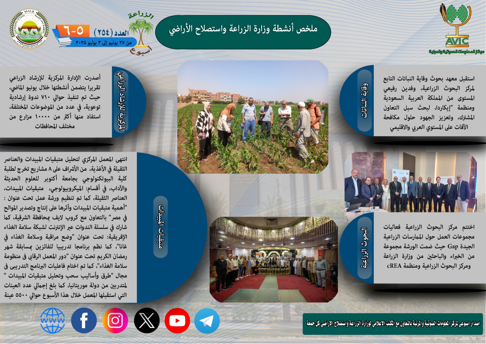 واستقبل معهد بحوث وقاية النباتات التابع لمركز البحوث الزراعية، وفدين رفيعي المستوى من المملكة العربية السعودية ومنظمة "إيكاردا، لبحث سبل التعاون المشترك، وتعزيز الجهود حلول مكافحة الآفات على المستوي العربي والاقليمي، كما أصدرت الإدارة المركزية للإرشاد الزراعي تقريرا يتضمن أنشطتها خلال يونيو الماضي، حيث تم تنفيذ حوالي 710 ندوة إرشادية توعوية، في عدد من الموضوعات المختلفة، استفاد منها أكثر من 10000 مزارع من مختلف المحافظات.