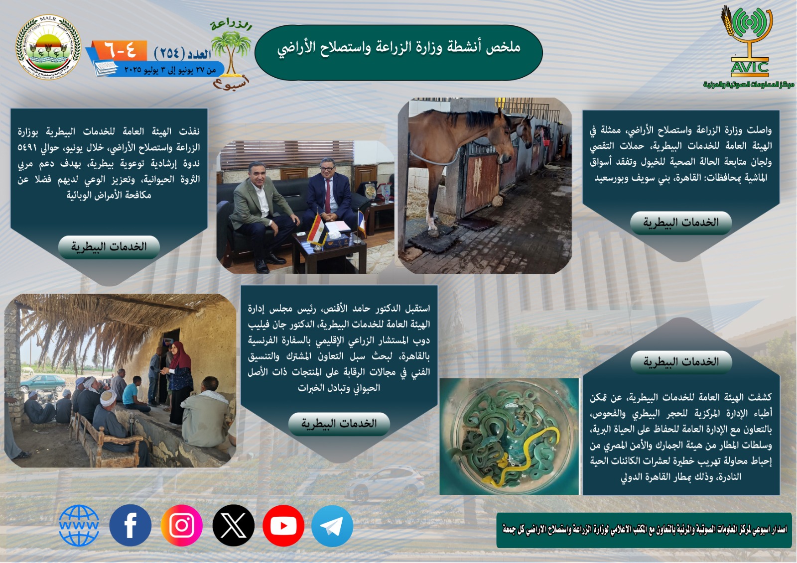 ونفذت الهيئة العامة للخدمات البيطرية بوزارة الزراعة واستصلاح الأراضي، خلال يونيو، حوالي 5491 ندوة إرشادية توعوية بيطرية، بهدف دعم مربي الثروة الحيوانية، وتعزيز الوعي لديهم فضلا عن مكافحة الأمراض الوبائية، كما استقبل الدكتور حامد الأقنص، رئيس الهيئة، الدكتور جان فيليب دوب المستشار الزراعي الإقليمي بالسفارة الفرنسية بالقاهرة، لبحث سبل التعاون المشترك والتنسيق الفني في مجالات الرقابة على المنتجات ذات الأصل الحيواني وتبادل الخبرات.