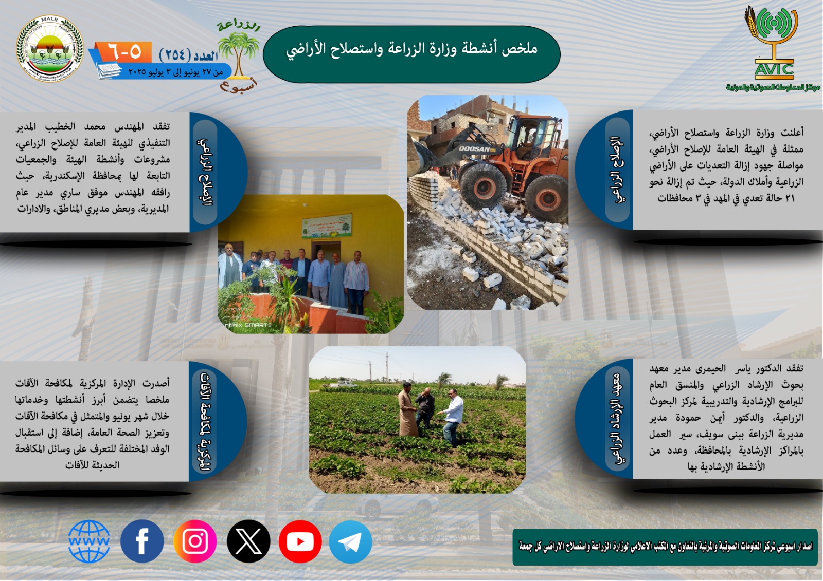 يذكر ان مركز المعلومات الصوتية والمرئية، والمكتب الاعلامي للوزارة، يصدران الجمعة من كل اسبوع، انفوجرافا وفيديو باسم: الزراعة في اسبوع، لالقاء الضوء على ملخص ما تم من انشطة وجهود، بكافة القطاعات والهيئات، التابعة للوزارة، فضلا عن انفوجراف وفيديو كل ثلاثاء باسم: الزراعة في كل مصر، حول انشطة وجهود القطاع الزراعي، بالمحافظات المختلفة.