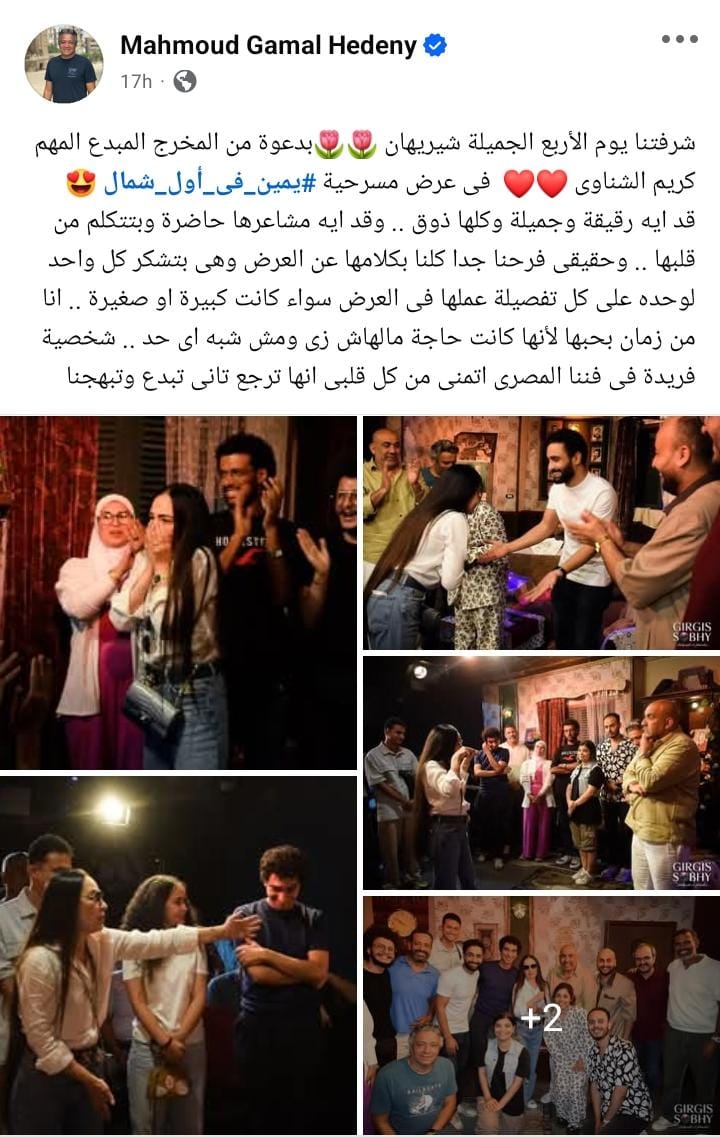 وأضاف: “قد ايه رقيقة وجميلة وكلها ذوق .. وقد ايه مشاعرها حاضرة وبتتكلم من قلبها .. وحقيقى فرحنا جدا كلنا بكلامها عن العرض وهى بتشكر كل واحد لوحده على كل تفصيلة عملها فى العرض سواء كانت كبيرة او صغيرة .. انا من زمان بحبها لأنها كانت حاجة مالهاش زى ومش شبه اى حد .. شخصية فريدة فى فننا المصرى اتمنى من كل قلبى انها ترجع تانى تبدع وتبهجنا”.