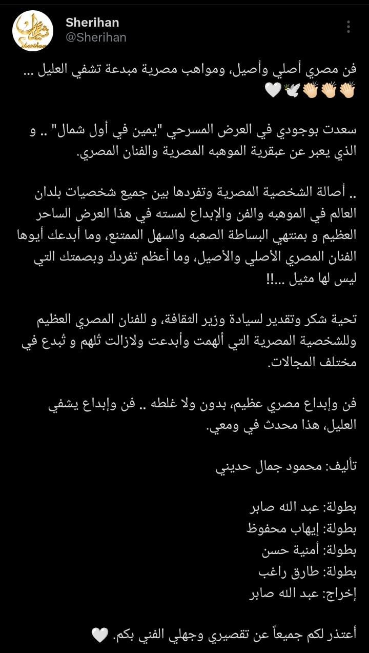 وكتبت شريهان تغريدة من خلال حسابها الرسمي عبر موقع التواصل الاجتماعي “X”، وقالت: "فن مصري أصلي وأصيل، ومواهب مصرية مبدعة تشفي العليل.. سعدت بوجودي في العرض المسرحي "يمين في أول شمال" .. و الذي يعبر عن عبقرية الموهبه المصرية والفنان المصري".