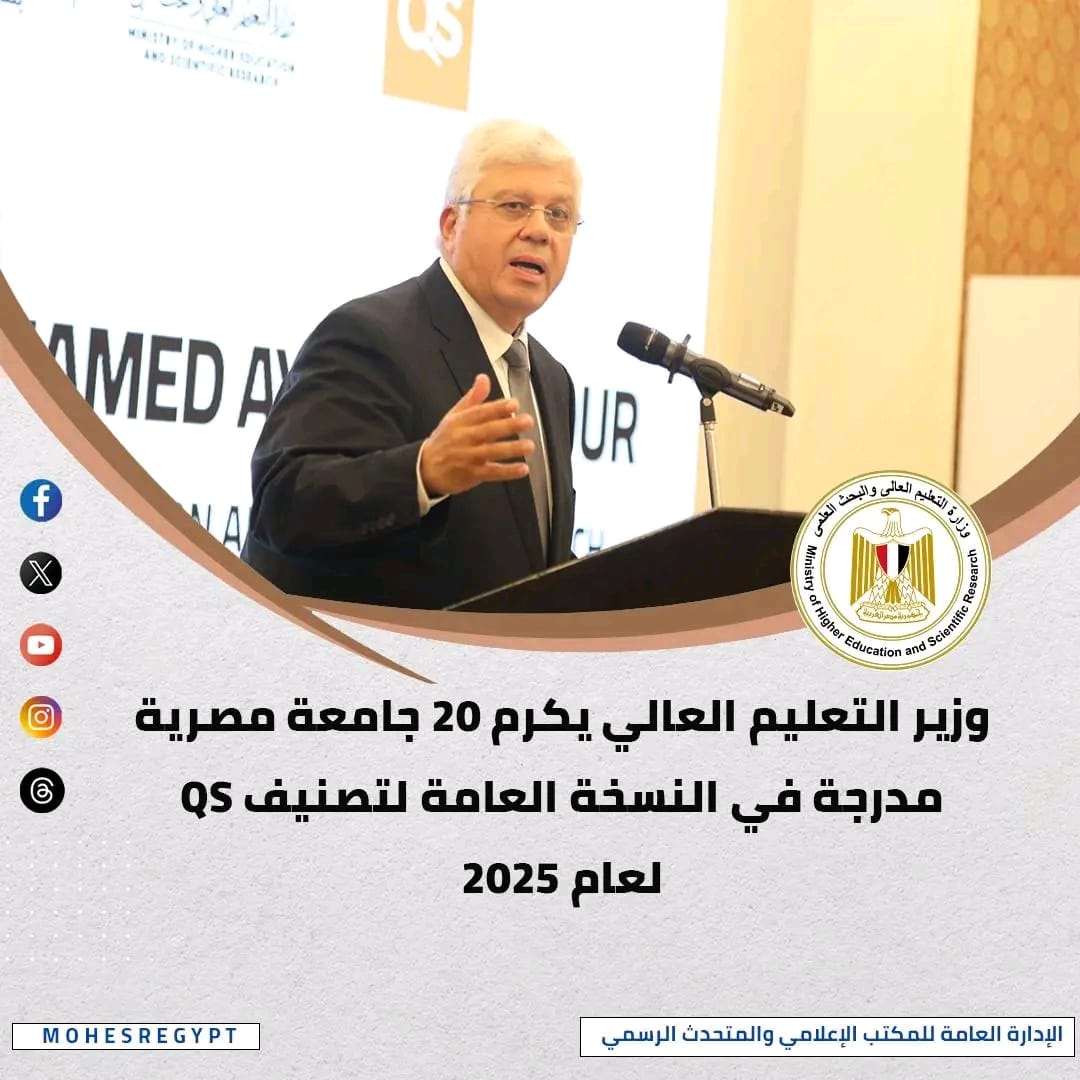 و شهد الوزير حفل تكريم الجامعات المصرية المدرجة في تصنيف QS العالمي لعام 2025، بحضور الدكتور أشوين فرنانديز، المدير الإقليمي لتصنيف QS لمنطقة الشرق الأوسط وإفريقيا وجنوب آسيا. وفي كلمته، أشار الوزير إلى تطور أداء الجامعات المصرية على المستوى الدولي، موضحًا أن عدد الجامعات المصرية المدرجة في تصنيف QS العام ارتفع إلى 20 جامعة في 2025، مقارنة بـ5 فقط في عام 2017، كما وصلت 36 جامعة إلى تصنيف QS للمنطقة العربية، و26 جامعة إلى تصنيف QS للاستدامة، ما يعكس تطور الأداء الأكاديمي والبحثي للمؤسسات التعليمية المصرية.