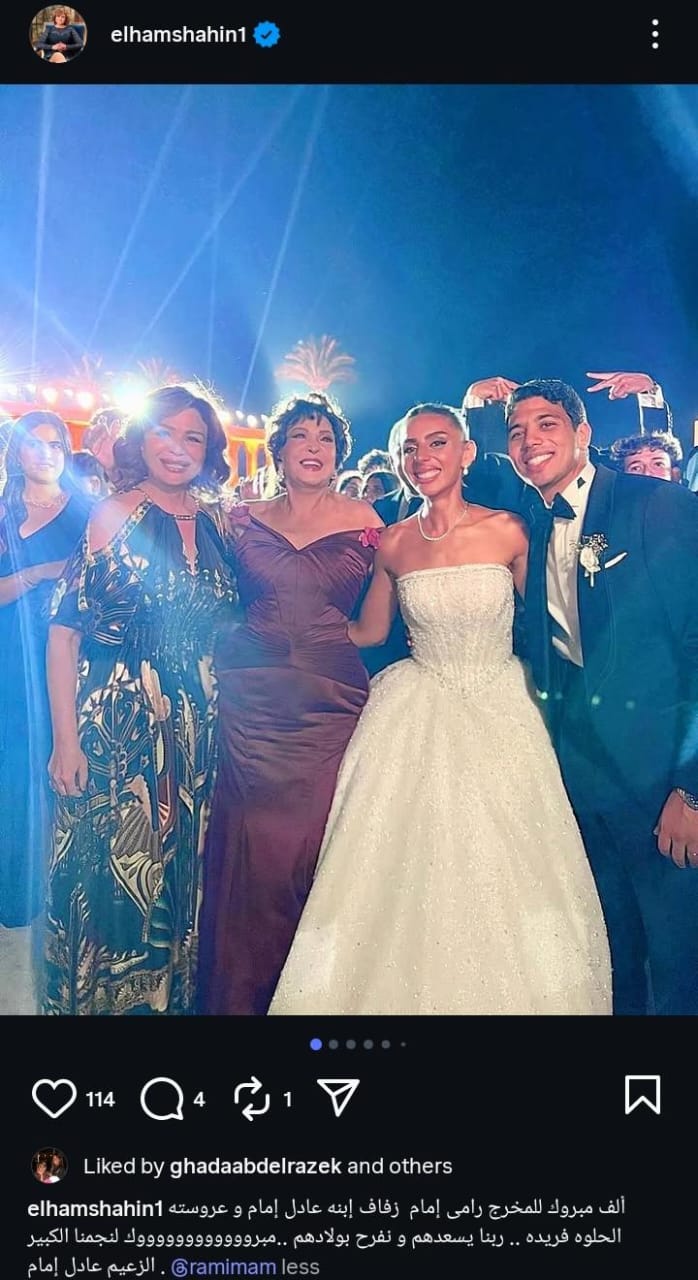 وشاركت إلهام شاهين جمهورها صور من حفل الزفاف التي تجمعها بالعروسين، وأصدقائها من الوسط الفني، من خلال حسابها الرسمي عبر موقع تبادل الصور والفيديوهات القصيرة “إنستجرام”، وكتبت: “ألف مبروك للمخرج رامي إمام زفاف إبنه عادل إمام وعروسته الحلوه فريده.. ربنا يسعدهم ونفرح بأولادهم.. ومبروك لنجمنا الكبير الزعيم عادل إمام”.