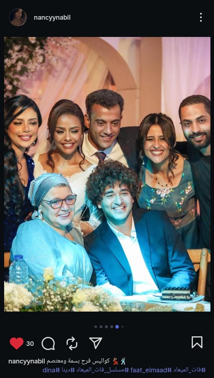 ونشرت نانسي نبيل صور حفل زفاف بسمة ومعتصم، والتي جمعتها بـ أبطال العمل، من خلال حسابها الرسمي عبر موقع تبادل الصور والفيديوهات القصيرة “إنستجرام”، وعلقت: “كواليس فرح بسمة ومعتصم.. مسلسل فات الميعاد”.