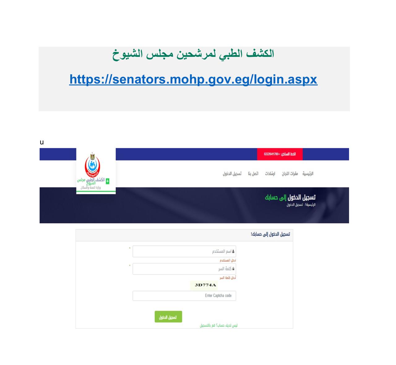 أوضح الدكتور حسام عبدالغفار، المتحدث الرسمي لوزارة الصحة والسكان، أن المنظومة الجديدة تتيح للمرشحين إتمام جميع الإجراءات الطبية إلكترونيًا عبر الرابط: https://senators.mohp.gov.eg/login.aspx](https://senators.mohp.gov.eg/login.aspx