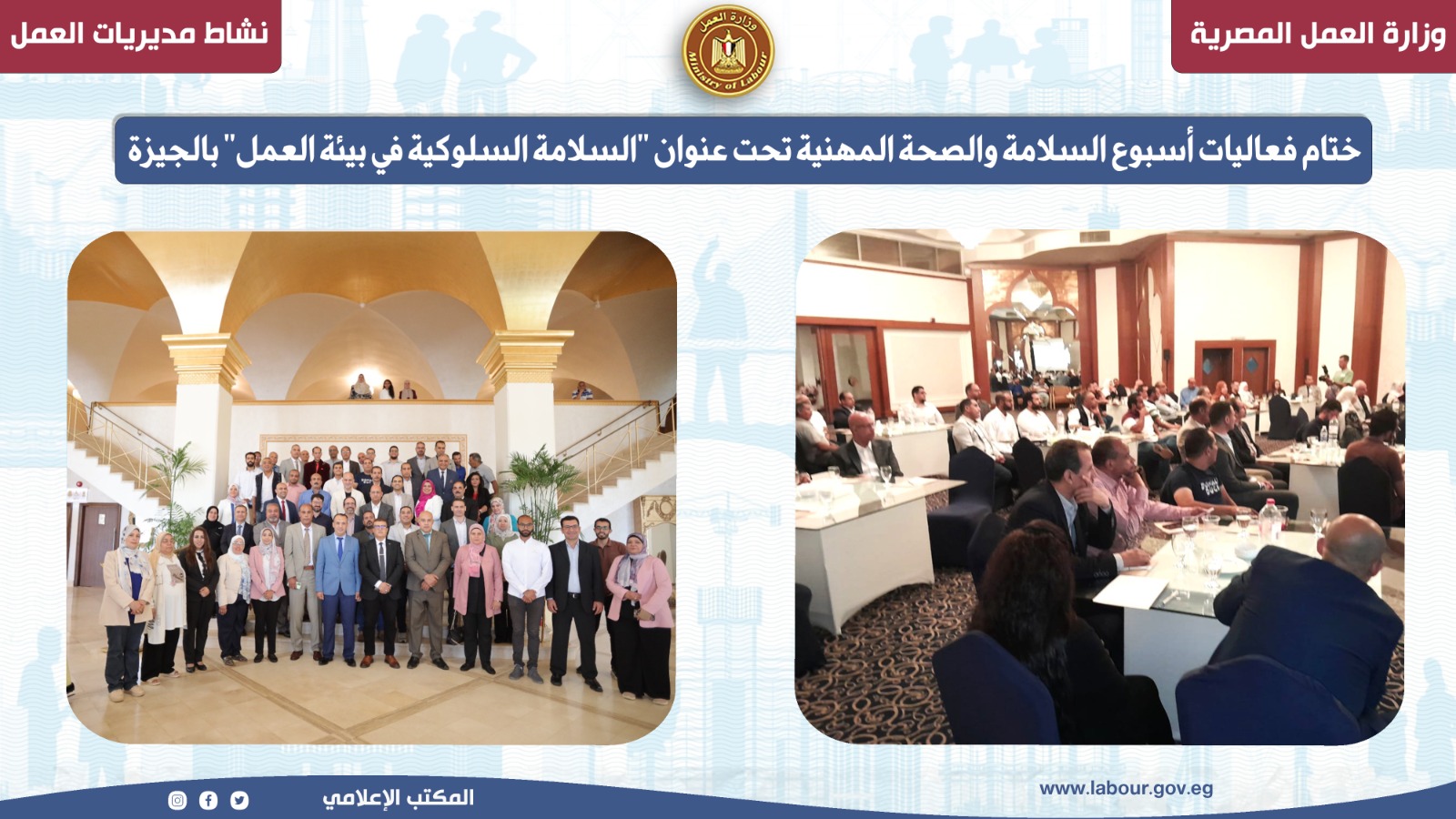 اختتمت مديرية العمل بمحافظة الجيزة فعاليات أسبوع السلامة والصحة المهنية تحت عنوان "السلامة السلوكية في بيئة العمل"، والذي أُقيم بفندق بيراميدز بارك ريزورت، وذلك برعاية وزير العمل محمد جبران، ومحافظ الجيزة المهندس عادل النجار، وبحضور المستشار خالد عبدالله مستشار وزير العمل والمشرف على الإدارة المركزية للسلامة والصحة المهنية وتأمين بيئة العمل.