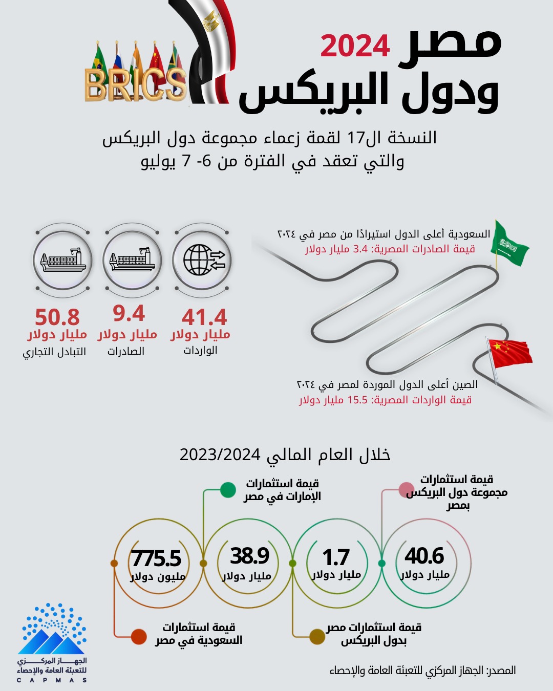 وقد تأسست مجموعة البريكس في عام 2006 بهدف تعزيز التعاون الاقتصادي بين الدول الأعضاء وتشكيل نظام اقتصادي عالمي أكثر توازنا، ويضم تجمع دول البريكس في الأساس ( البرازيل ـ روسيا ـ الهند ـ الصين ـ جنوب افريقيا ) وانضمت مصر رسمياً إلى تجمع البريكس مع بداية يناير 2024 مع عدد من الدول وهى السعودية ـ الإمارات ـ ايران ـ اثيوبيا ثم انضمت إندونيسيا رسميًا إلى المجموعة في يناير 2025 ، وضمن هذا الإطار يصدر الجهاز المركزى للتعبئة العامة والإحصاء بياناً صحفيًا حول العلاقات الاقتصادية بين مصر ومجموعة دول البريكس حيث أظهرت بيانات الجهاز اليوم الأحد الموافق 6 / 7 / 2025 ارتفاع حجم التبادل التجارى بين مصر و مجموعة دول البريكس ليصل إلى 50.8 مليار دولار خلال عام 2024 مقابل 42.5 مليار دولار خلال عام 2023 بنسبة ارتفاع قدرها 19.5% .