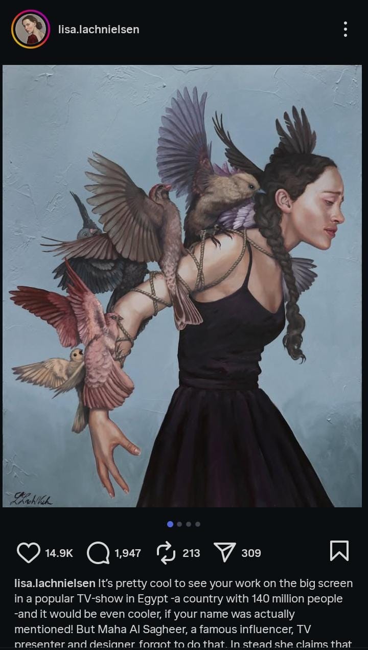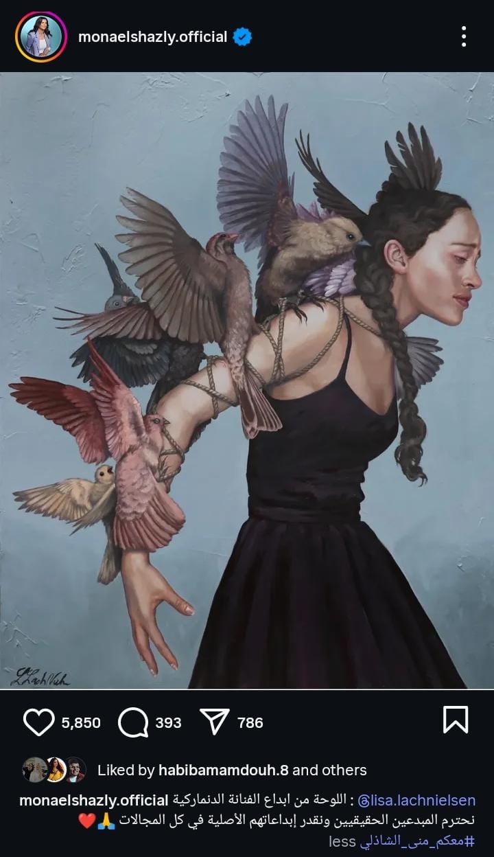 وردًا على ذلك، أعادت الإعلامية منى الشاذلي نشر الصورة، من خلال حسابها الرسمي عبر موقع تبادل الصور والفيديوهات القصيرة “إنستجرام”، وكتبت:"اللوحة من ابداع الفنانة الدنماركية ليزا لاش نيلسون، نحترم المبدعين الحقيقيين ونقدر إبداعتهم الأصلية في كل المجالات".