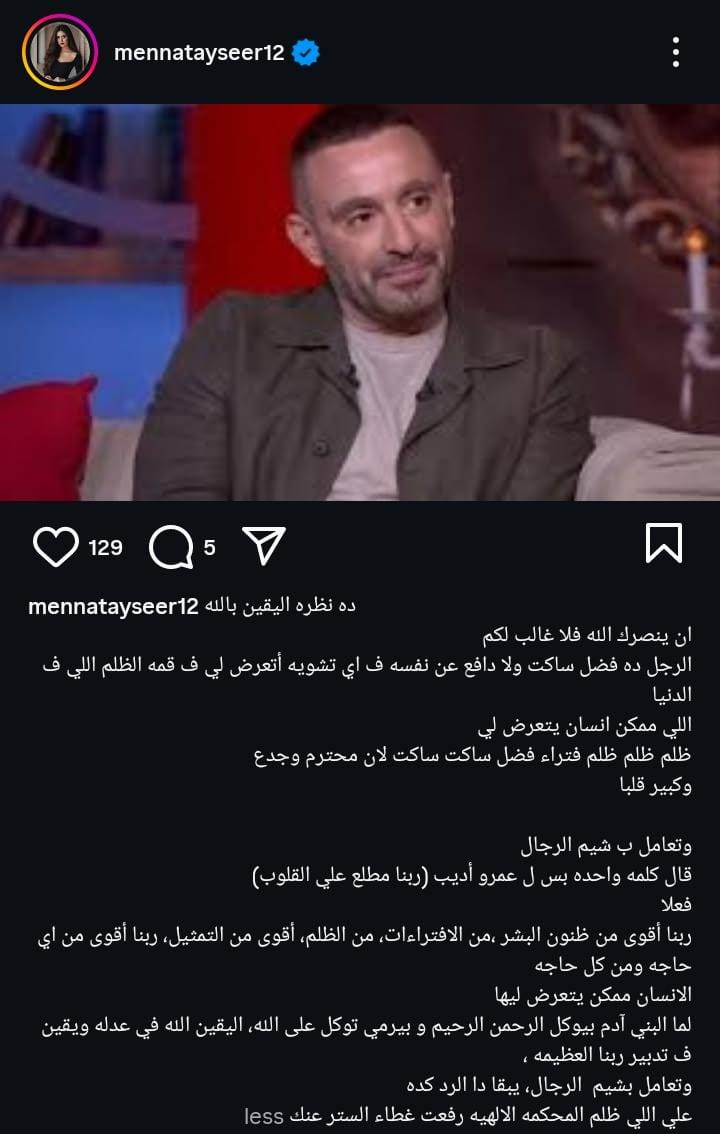 ونشرت منة تيسير صورة لـ أحمد السقا، من خلال حسابها الرسمي عبر موقع تبادل الصور والفيديوهات القصيرة "إنستجرام"، وكتبت: "ده نظره اليقين بالله، ان ينصرك الله فلا غالب لكم ، الرجل ده فضل ساكت ولا دافع عن نفسه ف اي تشويه أتعرض لي ف قمه الظلم اللي ف الدنيا اللي ممكن انسان يتعرض لي".