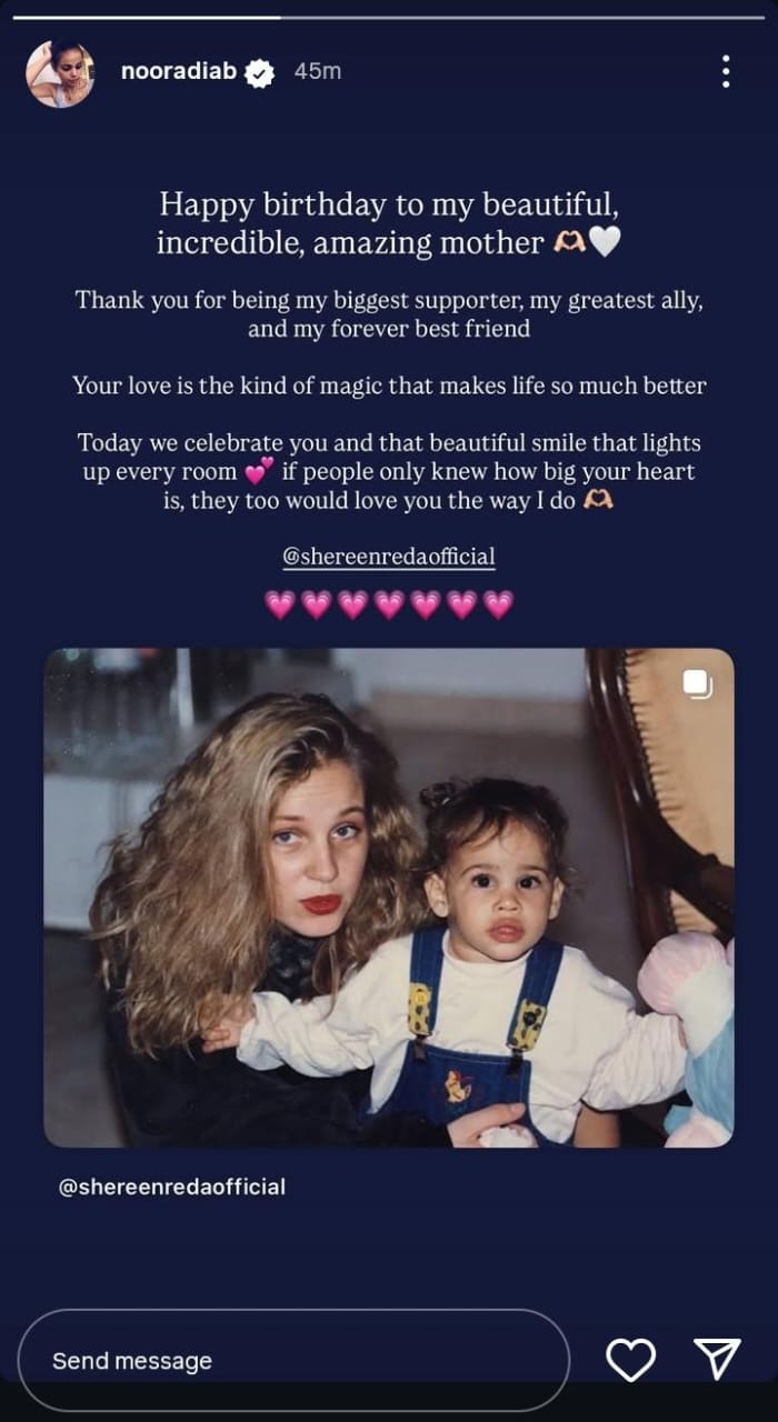 ونشرت نور دياب صورة تجمعها بوالدتها أثناء طفولتها، من خلال حسابها الرسمي عبر موقع تبادل الصور والفيديوهات القصيرة “إنستجرام”، وكتبت: “عيد ميلاد سعيد لـ أمي الجميلة، الرائعة، المذهلة.. شكرًا لكونك أكبر داعم لي، وأعظم حليفي، وأفضل صديقة لي إلى الأبد”.