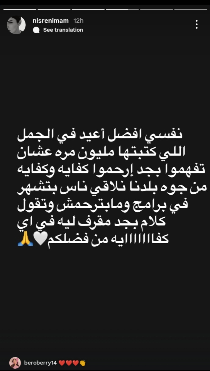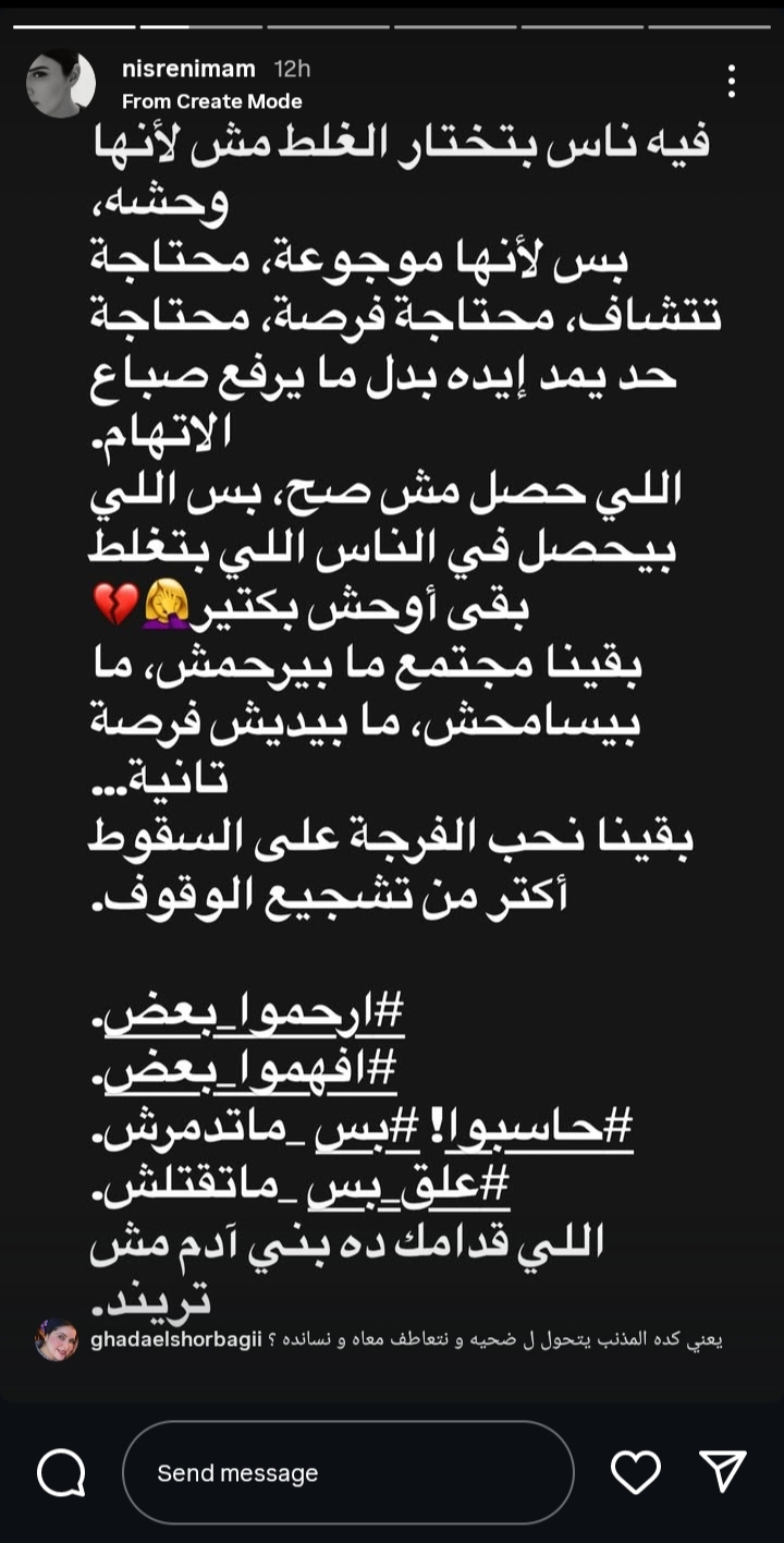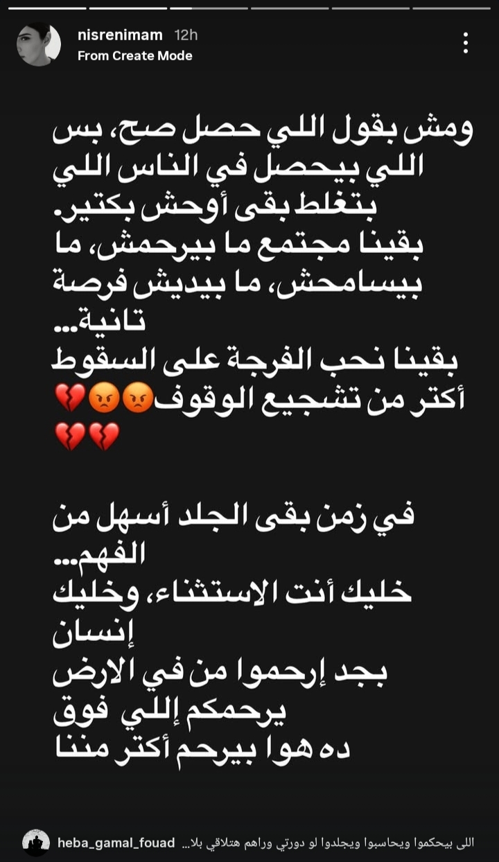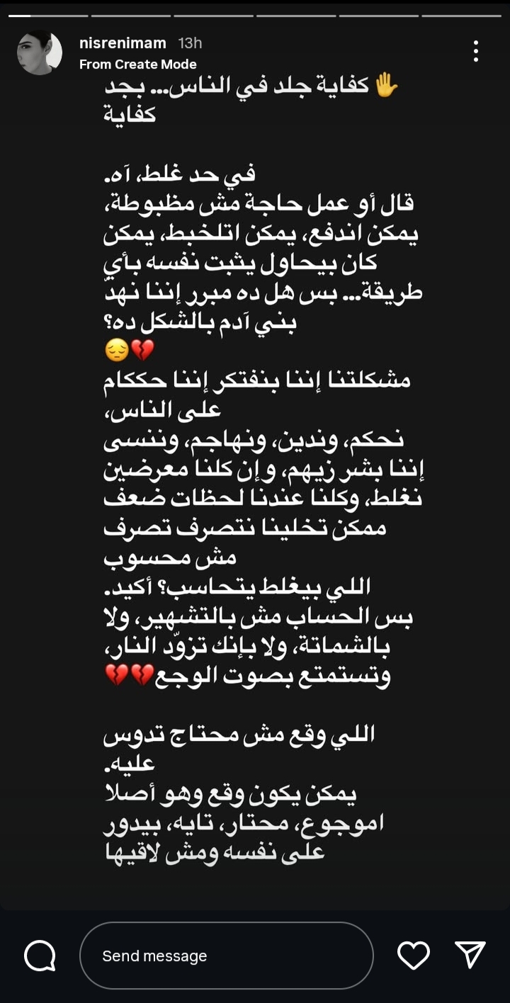 وكتبت نسرين إمام من خلال حسابها الرسمي عبر موقع تبادل الصور والفديوهات القصيرة إنستجرام، عبر خاصية استوري، قائلة: "كفاية جلد في الناس.. بجد كفاية في حد غلط، آه.. قال أو عمل حاجة مش مظبوطة يمكن اندفع، يمكن تلخبط، يمكن كان بيحاول يثبت نفسه بأي طريقة.. بس هل ده مبرر إننا نهد بني آدم بالشكل ده؟ مشكلتنا إننا بنفتكر إننا حكام على الناس نحكم، وندين، ونهاجم، وننسى إننا بشر زيهم، وإن كلنا معرضين نغلط، وكلنا عندنا لحظات ضعف ممكن تخلينا نتصرف تصرف مش محسوب.. اللي بيغلط يتحاسب؟ أكيد. بس الحساب مش بالتشهير، ولا بالشماتة، ولا بإنك تزود النار، وتستمتع بصوت الوجع.. اللي وقع مش محتاج تدوس عليه..يمكن يكون وقع وهو أصلا موجوع، محتار، تايه، بيدور على نفسه ومش لاقيها".