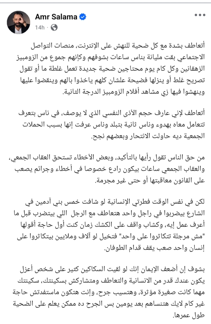 وكتب عمرو سلامة من خلال منشور، عبر موقع التواصل الاجتماعي فيسبوك، قال: "أتعاطف بشدة مع كل ضحية للنهش على الإنترنت، منصات التواصل الاجتماعي بقت مليانة بناس ساعات بشوفهم وكإنهم جموع من الزومبيز الزهقانين وكل كام يوم محتاجين ضحية جديدة تعمل غلطة ما أو تقول تصريح غلط أو ينزلها فضيحة علشان كلهم ياخذوا بالهم وينقضوا عليها وينهشوا فيها زي مشاهد أفلام الزومبيز الدرجة الثانية".