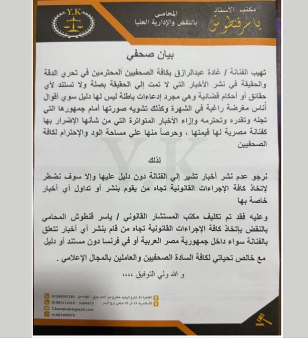 وقد كلفت رسمياً مكتب المستشار ياسر قنطوش لاتخاذ كل الإجراءات القانونية ضد كل من ينشر أو يروّج أي أخبار تمسها دون مستندات واضحة، سواء داخل مصر أو خارجها، وخصوصاً في فرنسا حيث تم تداول بعض الادعاءات.
