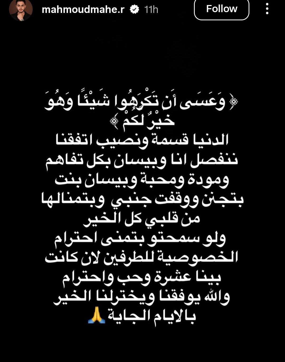 كما أعلن محمود ماهر عن الانفصال بهدوء، حيث كتب من خلال حسابه الرسمي عبر موقع تبادل الصور والفيديوهات القصيرة 'إنستجرام'، عبر خاصية استوري: 'وعسى أن تكرهوا شيئًا وهو خير لكم".