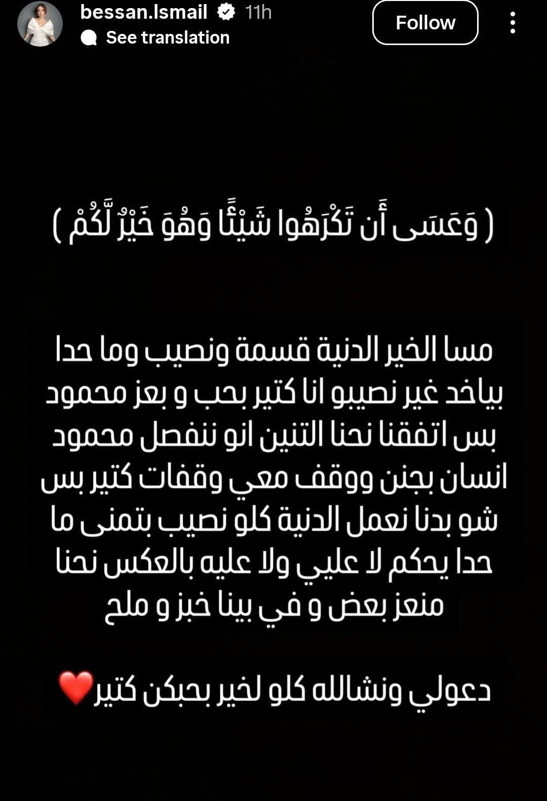 تابع: “ولو سمحتو بتمنى احترام الخصوصية للطرفين لأن كانت بينا عشرة وحب واحترام، والله يوفقنا ويختر لنا الخير بالأيام الجاية”.