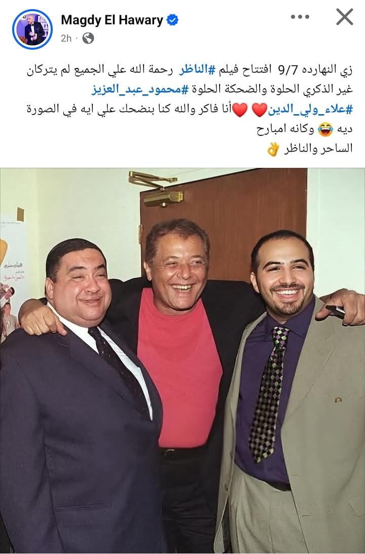 ونشر مجدي الهواري صورة تجمعه بالفنان الراحل علاء ولي الدين و الفنان محمود عبد العزيز، من خلال حسابه الرسمي عبر موقع التواصل الاجتماعي “فيسبوك”، وعلق: "زي النهارده 9 يوليو افتتاح فيلم الناظر رحمة الله على الجميع، لم يتركان غير الذكرى الحلوة والضحكة الحلوة محمود عبد العزيز و علاء ولي الدين".