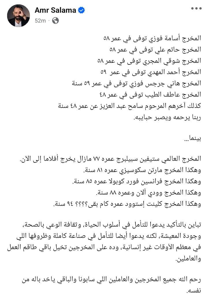 وكتب عمرو سلامة من خلال حسابه الرسمي عبر موقع التواصل الاجتماعي “فيسبوك”، قال: “المخرج أسامة فوزي توفى في عمر ٥٨، المخرج حاتم علي توفى في عمر ٥٨، المخرج شوقي المجري توفى في عمر ٥٨، المخرج أحمد المهدي توفى في عمر ٥٩، المخرج هاني جرجس فوزي توفى في عمر ٥٩ سنة، المخرج عاطف الكيب توفى في عمر ٤٨، كذلك آخرهم المرحوم سامح عبد العزيز عن عمر ٤٨ سنة.. ربنا يرحمه ويصبر حبايبه".