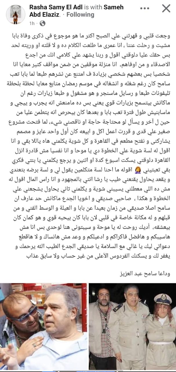 ابنة سامي العدل تنعي سامح عبد العزيز وتكشف مواقف مؤثرة بينهما