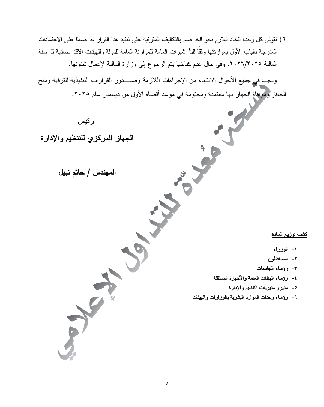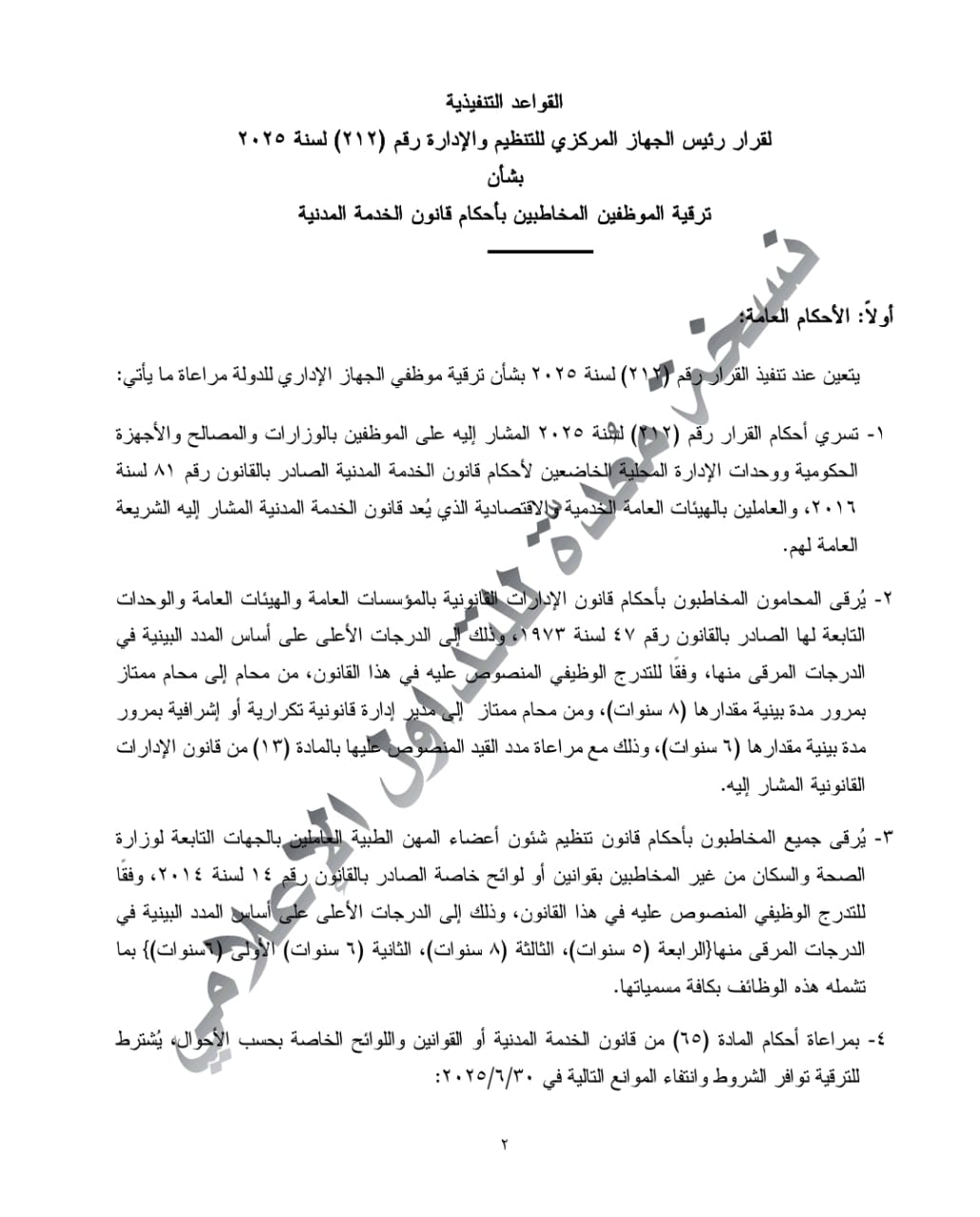 • موعد التنفيذ: تصدر القرارات التنفيذية للترقية اعتبارًا من 1 يوليو الجاري، بعد اعتمادها من لجنة الموارد البشرية بالجهات المعنية ومراجعتها من الجهاز ووزارة المالية.