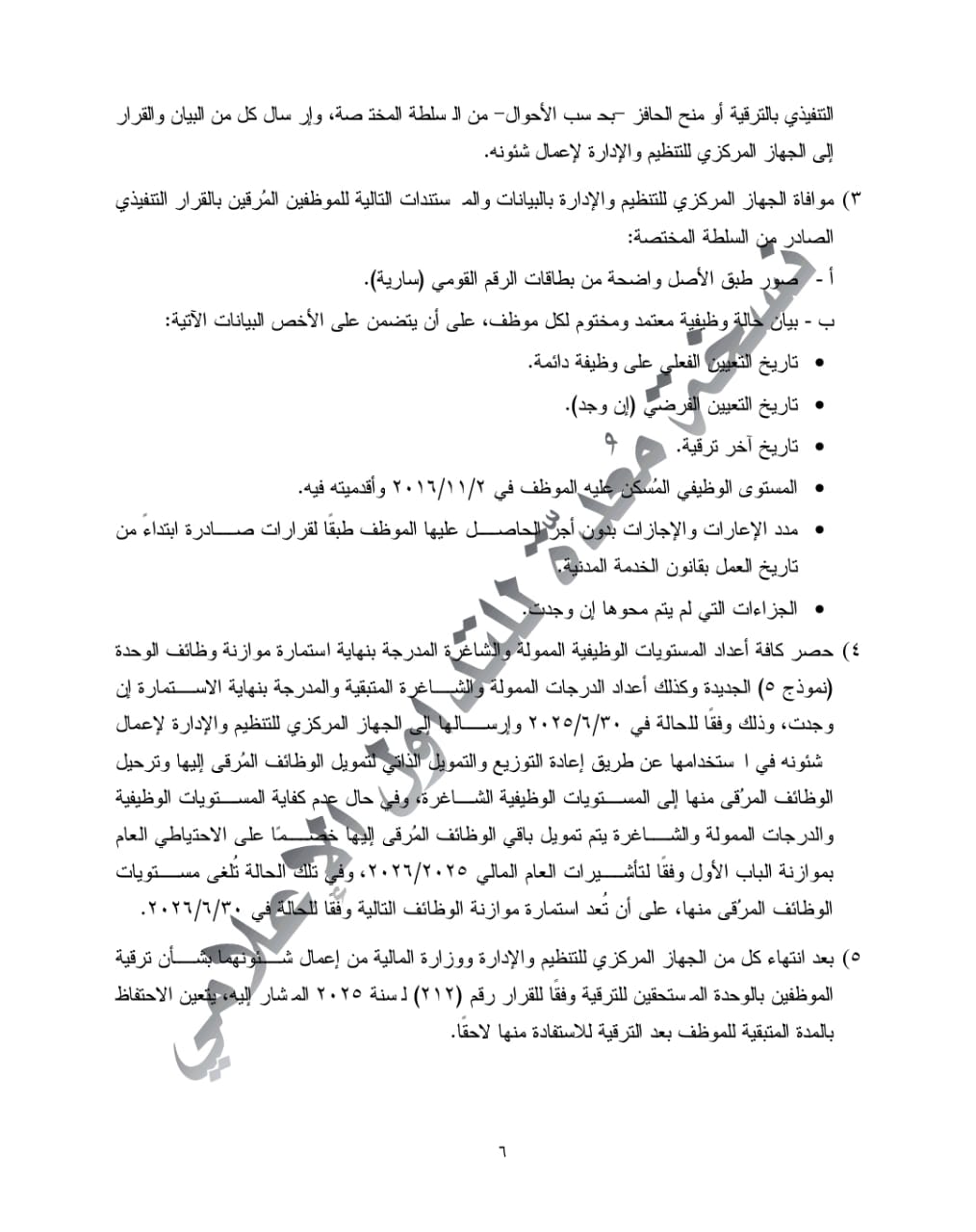 • التزامات الجهات الإدارية: يتوجب على جميع وحدات الجهاز الإداري حصر المستحقين وإرسال بياناتهم ومستنداتهم كاملة إلى الجهاز المركزي للتنظيم والإدارة في موعد أقصاه 1 ديسمبر 2025، تجنبًا لتأخير الترقيات.