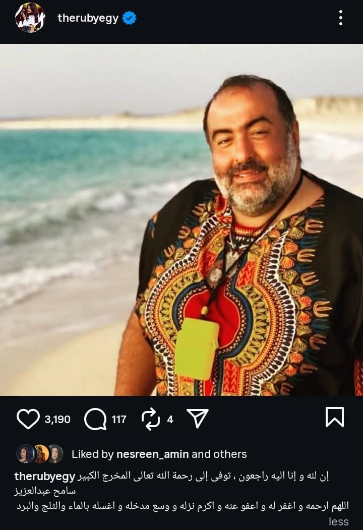 ونشرت روبي صورة له، من خلال حسابها الرسمي عبر موقع تبادل الصور والفيديوهات القصيرة "إنستجرام"، وكتبت: "إن لله و إنا اليه راجعون، توفى إلى رحمة الله تعالى المخرج الكبير سامح عبد العزيز.. اللهم ارحمه واغفر له واعفو عنه واكرم نزله ووسع مدخله واغسله بالماء والثلج والبرد".