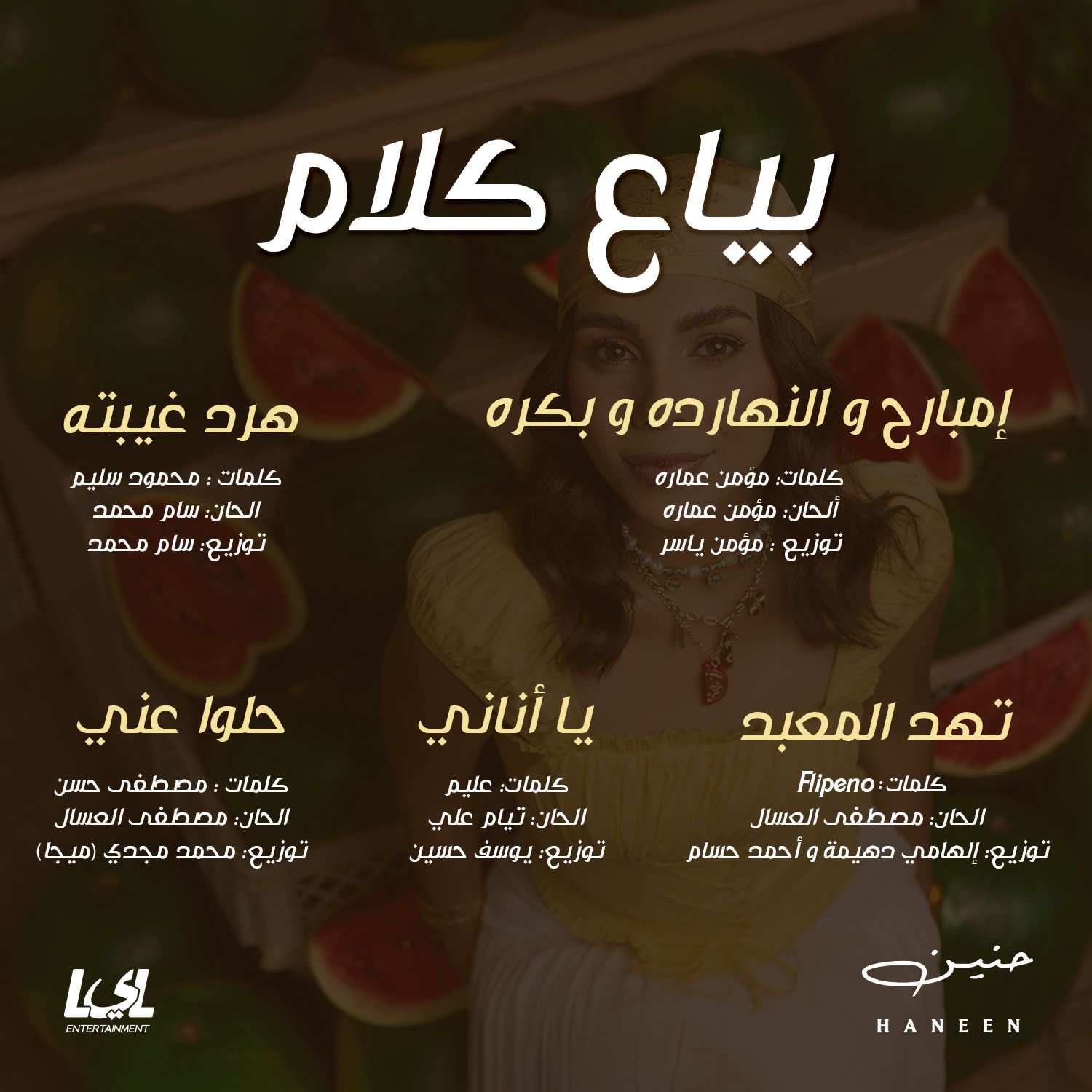 المطربة حنين طرحت الألبوم الغنائى على جزأين ، حيث تم طرح الجزء الأول اليوم الخميس ، بينما سيتم طرح الجزء الثانى خلال الأسابيع القليلة المقبلة ، وجاءت أسماء أغانى ألبوم بياع كلام (صحاب - تكة تكة - يا أبو عين زايغة - قالي قلبك - لا لا لا - امبارح والنهاردة وبكرا - هرد غيبته - تهد المعبد - يا أناني - حلوا عني ) .